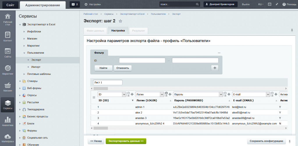 3) Экспорт любых полей из таблицы БД с выбранной сущностью