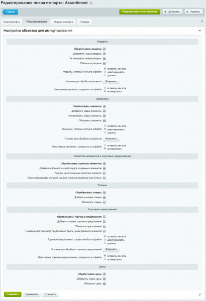 Основные объекты, доступные для импорта:- Разделы инфоблока.