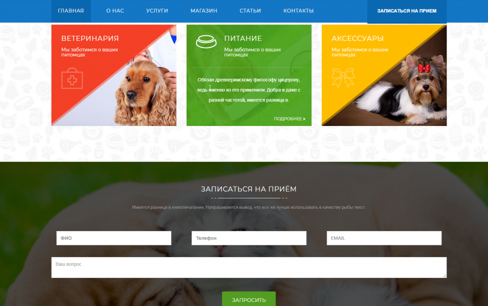 Отлично подходит для компаний, занимающихся ветеринарией. Присутствует возможность переделать сайт под любой тип бизнеса и любую тематику.