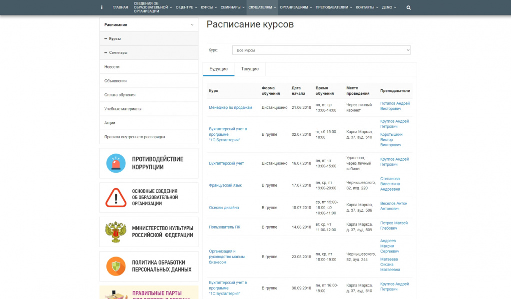 - Расписание занятий с просмотром по курсам и по преподавателям.