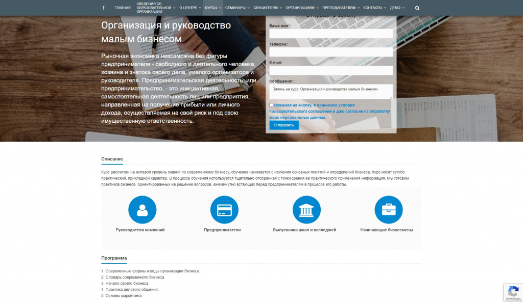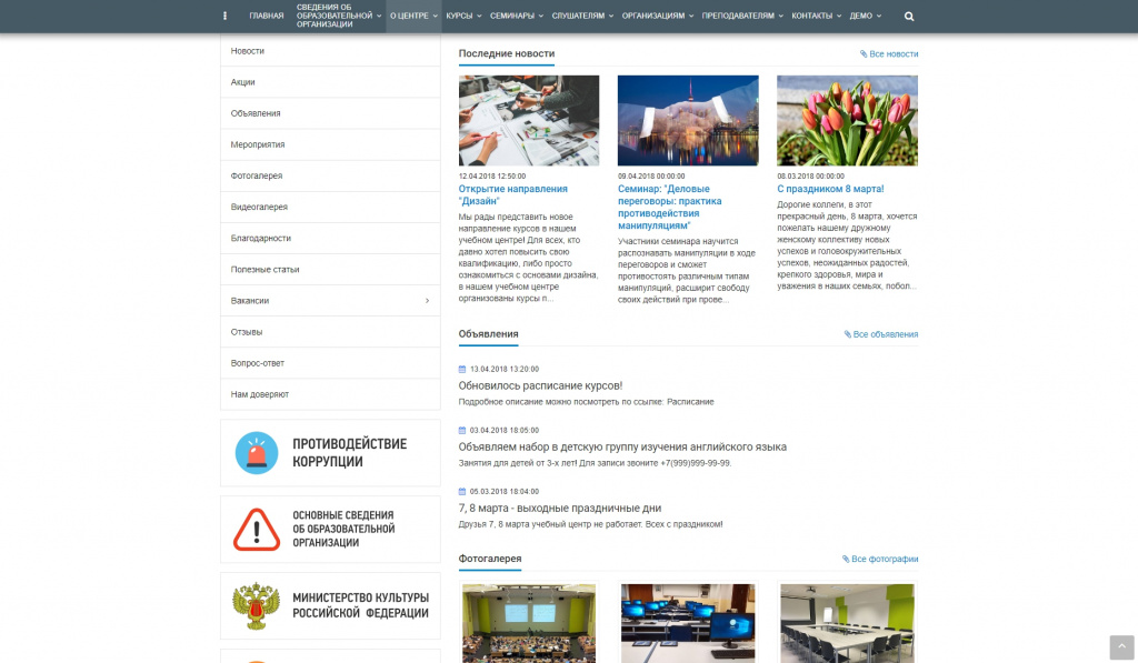 «SIMAI: Сайт учебного центра» - современное функциональное решение, разработанное специально для сайта учебного центра. Решение учитывает все требования законодательства РФ, имеет версию для слабовидящих, адаптивно к мобильным устройствам и содержит полный функционал современного сайта учебного центра.
