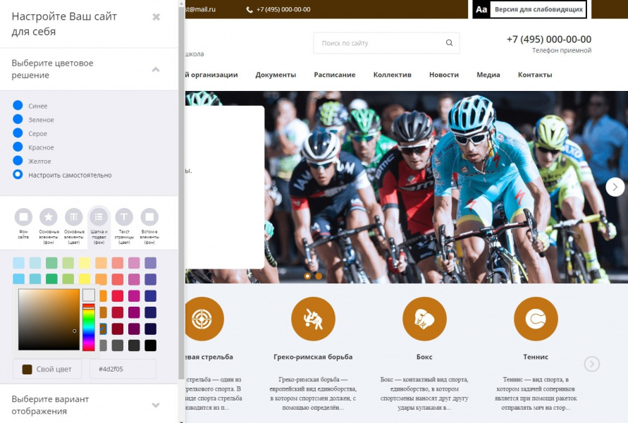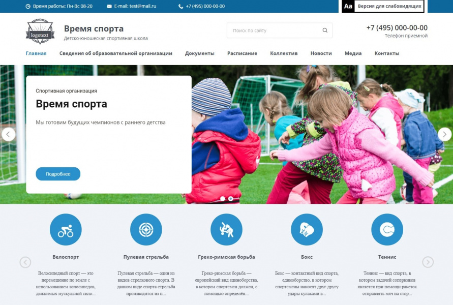 Современная спортшкола в современном дизайне. Адаптивная верстка для использования сайта спортшколы на любых устройствах, множество персональных настроек.