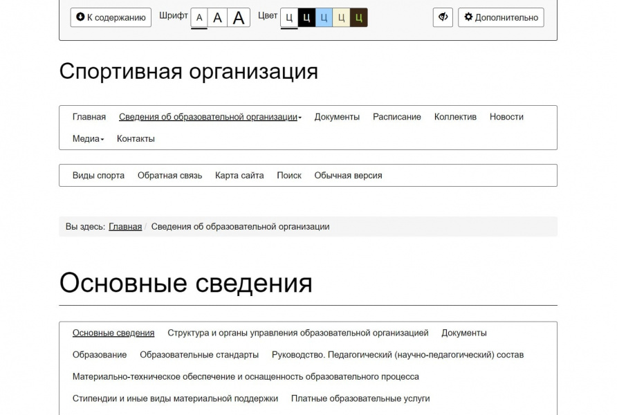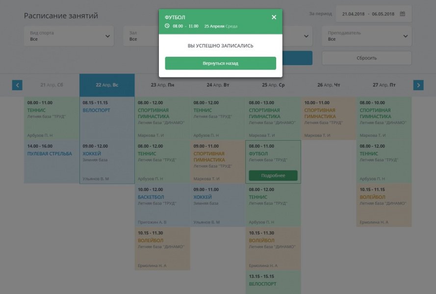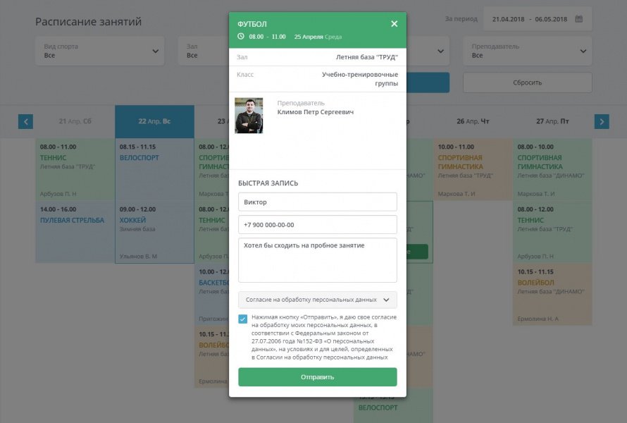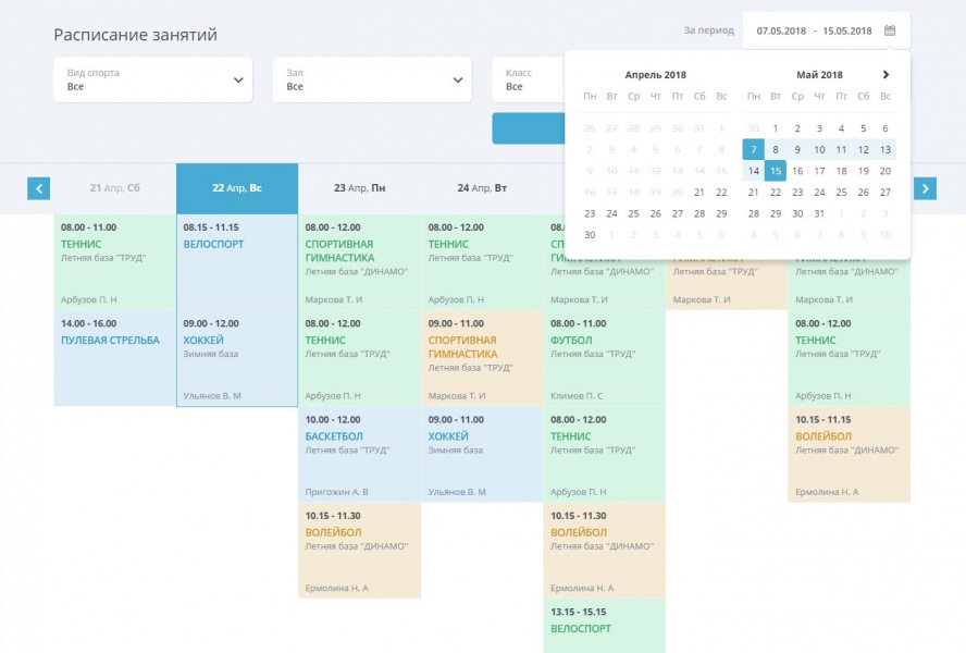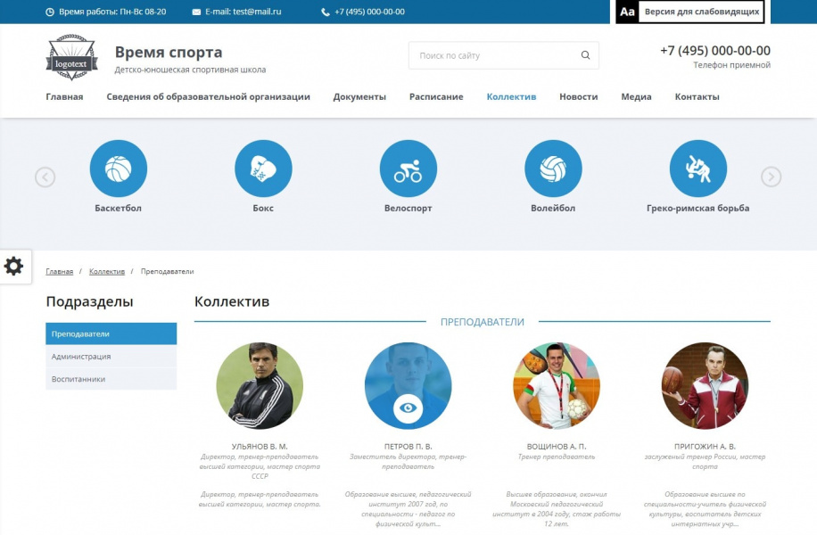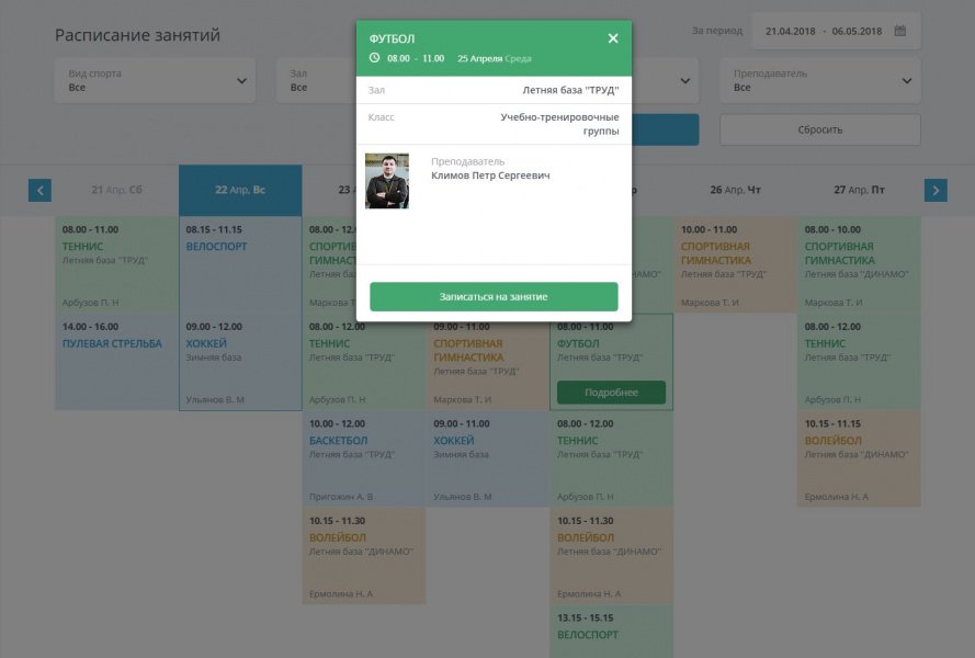 - Для каждого вида спорта предусмотрен собственный раздел со списком преподавателей (тренеров) и расписанием