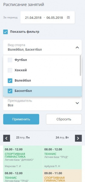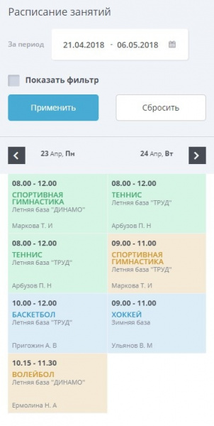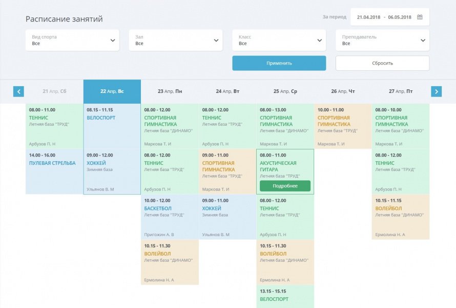 - Модуль расписания позволяющий создать полноценное расписание занятий с фильтрами по классам (группам), направлениям (видам спорта), преподавателям (тренерам) и месту проведения.