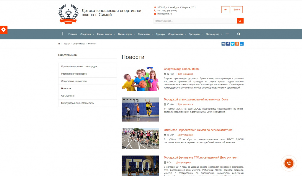 - Виджеты социальных сетей и кнопки расшаривания страниц – делитесь в соцсетях новостями и мероприятиями со страниц спортшколы всего в один клик!