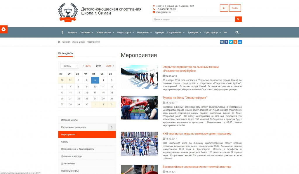 - Раздел «Мероприятия» для размещения информации о соревнованиях, турнирах и других важных событиях спортивной жизни школы.