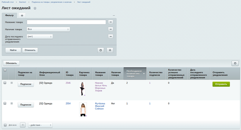 Подписка на товары: уведомление о наличии на 1С-Битрикс