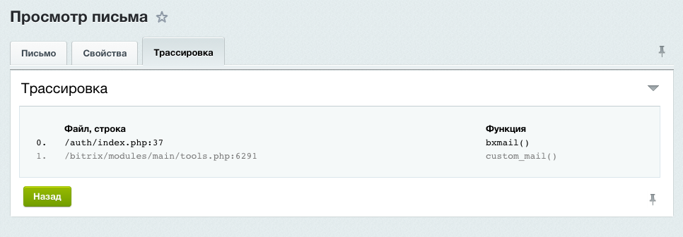 Кроме того, с помощью модуля можно просмотреть все функции, которые были последовательно вызваны в Битриксе перед отправкой каждого письма (трассировка). Таким образом программистам будет несложно распознать, какая именно функция в Битриксе «виновна» в отправке любого письма с сайта.