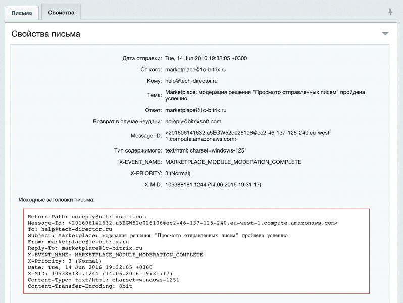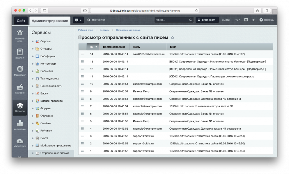 Модуль не просто позволяет видеть события, зарегистрированные в таблице b_event — он показывает информацию обо всех письмах, отправленных через функцию bxmail().