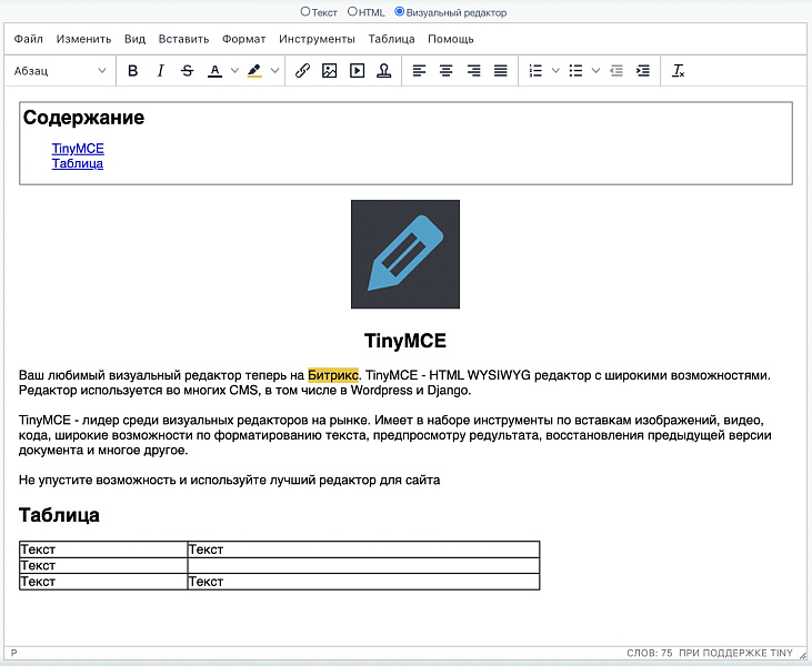 Визуальный редактор TinyMce на 1С-Битрикс