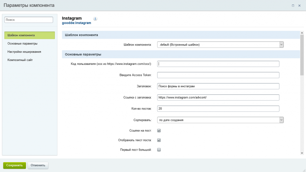 goodde.instagram (в визуальном редакторе «Хороший Дизайн» ? «Instagram»). Компонент выгружает посты из instagram в созданный при установке инфоблок goodde.instagram.
