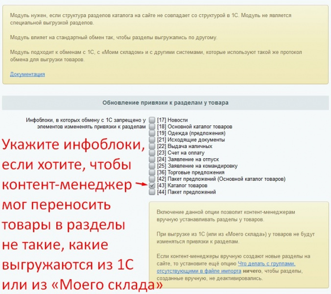 Заполнение разделов на сайте вручную, запрет 1С изменять разделы у товаров:Отметьте опцию «Инфоблоки, в которых обмену с 1С запрещено у элементов измененять привязки к разделам».