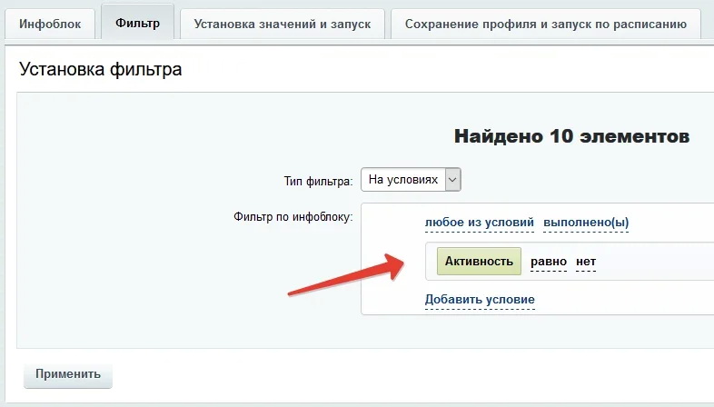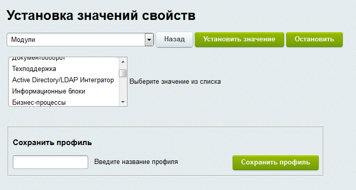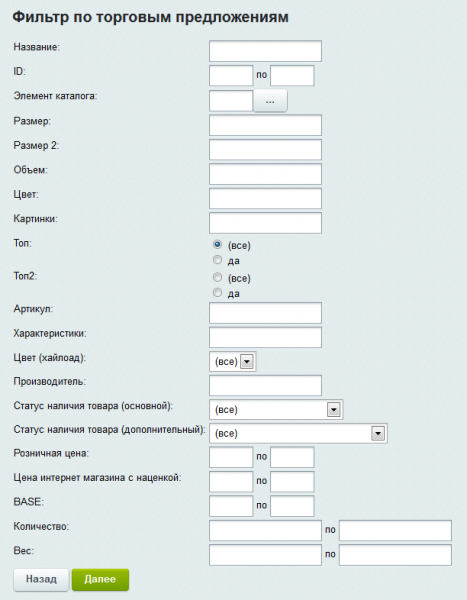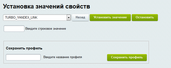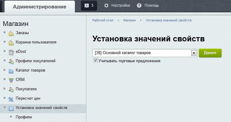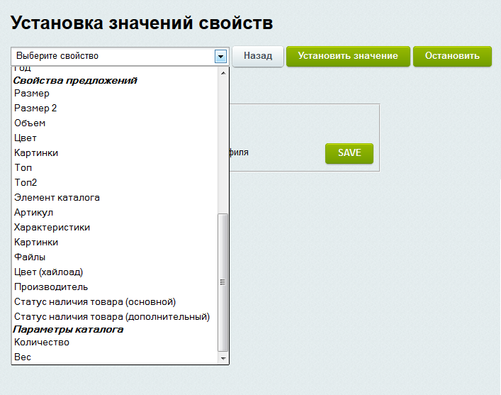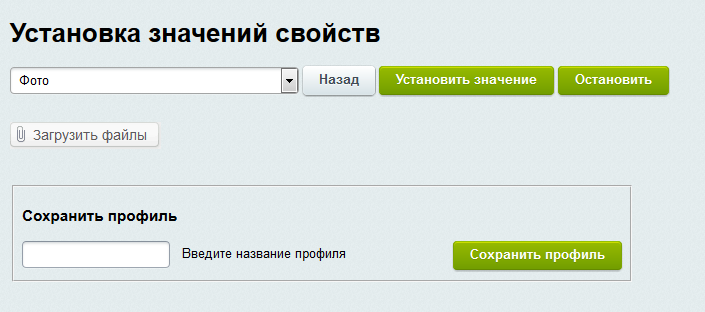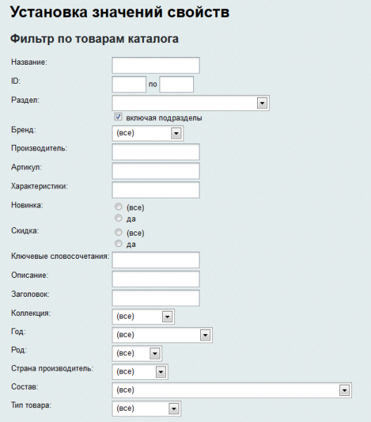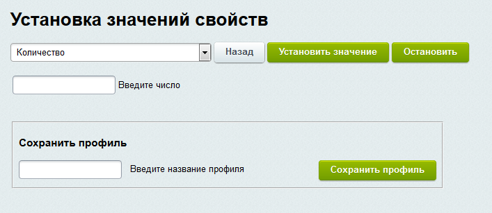 Блок управления свойствами позволяет выставить в зависимости от выбранного набора условий или же сразу для всего инфоблока и принадлежащих ему товарных предложений значения свойств