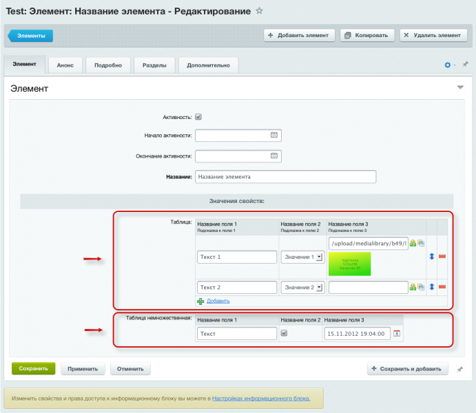 Может использоваться пользователями- Для вывода таблиц у элементов инфоблоков (новостей, статей и пр.) в публичной части сайта без необходимости правки шаблонов компонентов