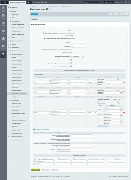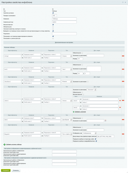 Особенности- 8 возможных типов данных для каждой колонки таблицы: Строка, Текст, Флажок, Список (в т.ч. множественный), Дата/Время, Путь к файлу (с возможностью выбора из медиабиблиотеки и структуры сайта), Файл (загружаемый), Привязка (доступен при наличии модуля Универсальные свойства привязки)
