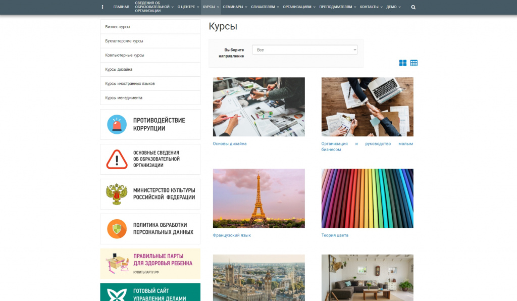 - Динамический каталог курсов и семинаров с группировкой по направлениям и двумя видами отображения.