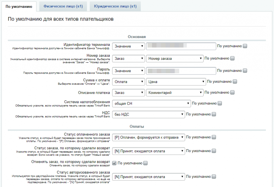 - через Банк Тинькофф (в обработчике платежей необходимо указать систему налогообложения и режим НДС);