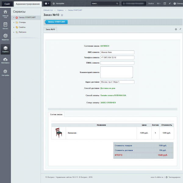 - для удобства работы с заказами создан интерфейс в административном разделе в меню Сервисы-> Заказы STARTCART