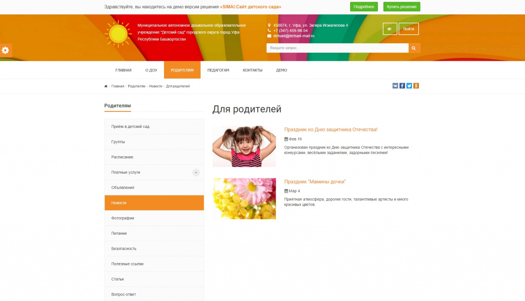«SIMAI: Сайт детского сада» - идеальное решение для быстрого запуска адаптивного сайта дошкольного образовательного учреждения с версией для слабовидящих. Отлично подходит для государственных, ведомственных и коммерческих детских садов, центров развития ребенка любых форм собственности.