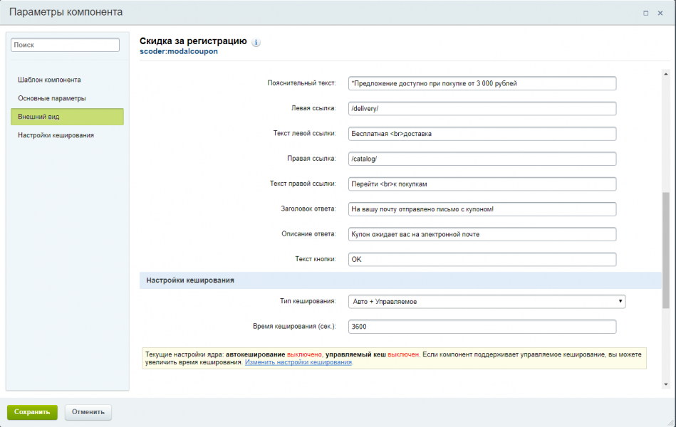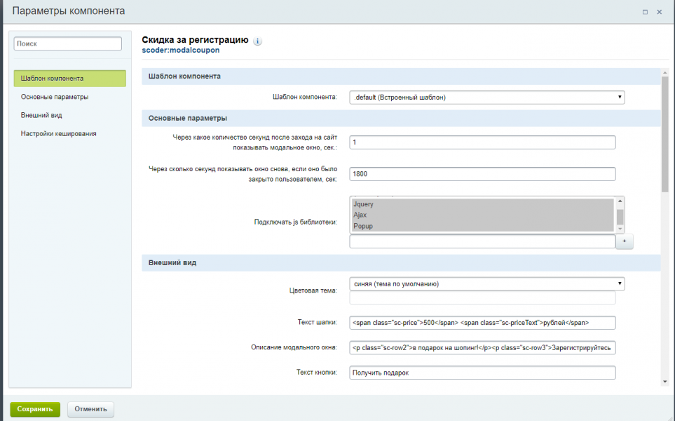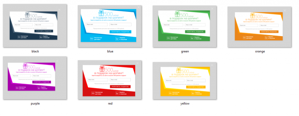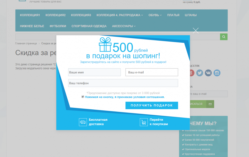 позволяет выводить всплывающее (модальное) окно с предложением о регистрации, куда необходимо вводить имя и email пользователя, для того чтобы зарегистрироваться и получить купон. Данное окно можно настроить, чтобы оно выходило только через указанное время после того, как пользователь зайдет на сайт. А также имеются некоторые другие интересные настройки.