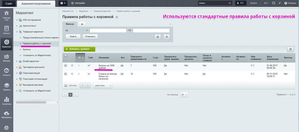 правила работы с корзиной, которые имеют ряд гибких настроек. А это означает, что нет никаких проблем в предоставлении скидки как