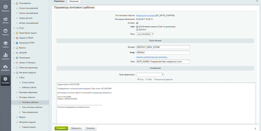 может быть применено не только для скидок. Сам факт скидок можно исключить, если такое действительно требуется. Для этого требуется всего лишь сделать неактивной созданную скидку (правило работы с корзиной) и деактивировать шаблон почтового события.