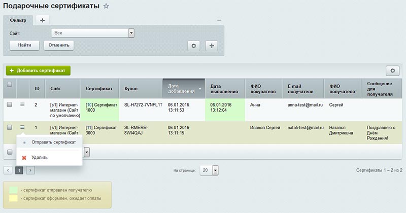Далее покупатель, которому был отправлен сертификат, оформляет свой собственный заказ, указывая в корзине купон и получает для своего заказа скидку, равную стоимости сертификата.