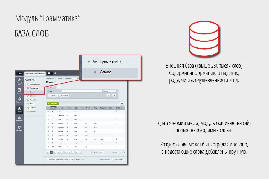 Для работы данного модуля была создана специальная база, в которой хранится информация о каждом слове: падежах, роде, числе, одушевленности и т.д. На данный момент база содержит более 230 тысяч записей и постоянно пополняется новыми словами. Все слова, которые Вы будете использовать, автоматически скачиваются из базы и сохраняются на Вашем сайте. Если какого-либо слова нет в базе, его можно добавить вручную.