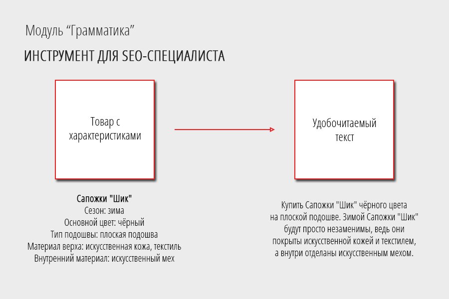 С помощью данного модуля можно создать SEO-шаблон, который будет брать параметры товара и составлять из них удобочитаемый текст. Например, вместо "Купить Футболка, цвет красный, материал хлопок" будет выводиться "Купить Футболку красного цвета из хлопка".
