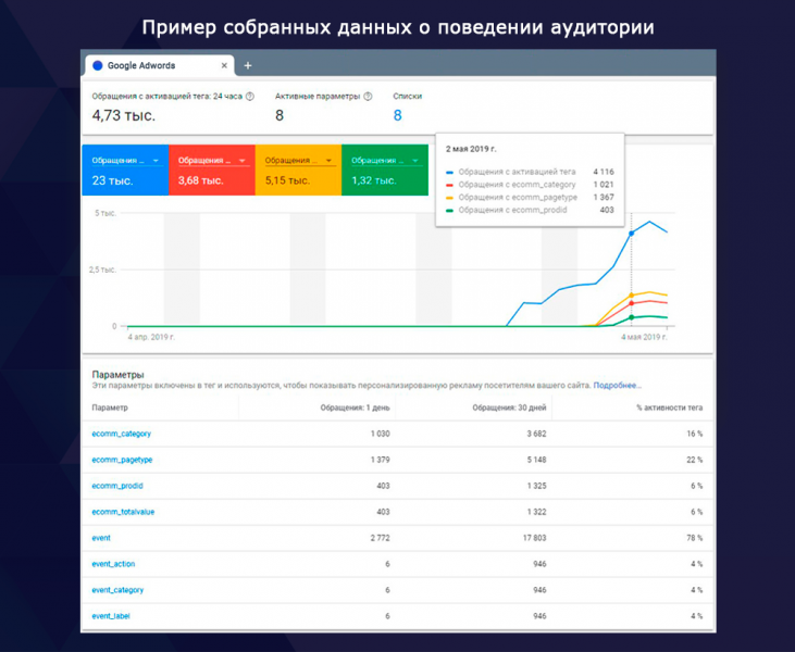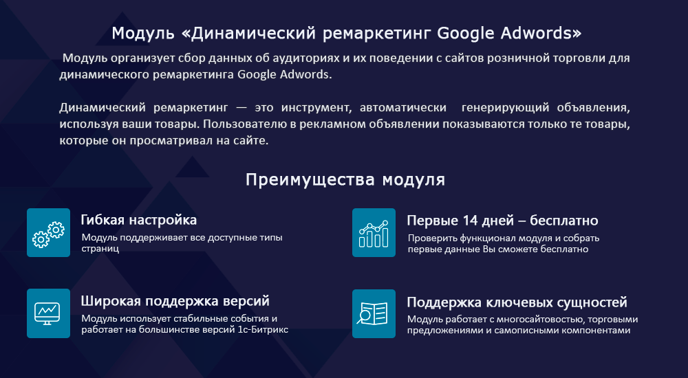 Модуль организует cбор данных об аудиториях и их поведении с сайтов розничной торговли для динамического ремаркетинга Google Adwords