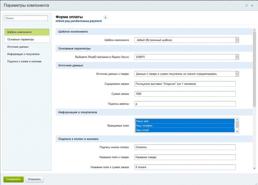 В состав модуля входит:- компонент формы оплаты для приема платежей в 1 клик, доступный на редакциях "Первый сайт", "Старт", "Стандарт", "Эксперт", "Малый бизнес" и "Бизнес"