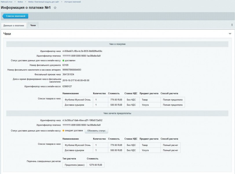 - Формирование чека зачета предоплаты