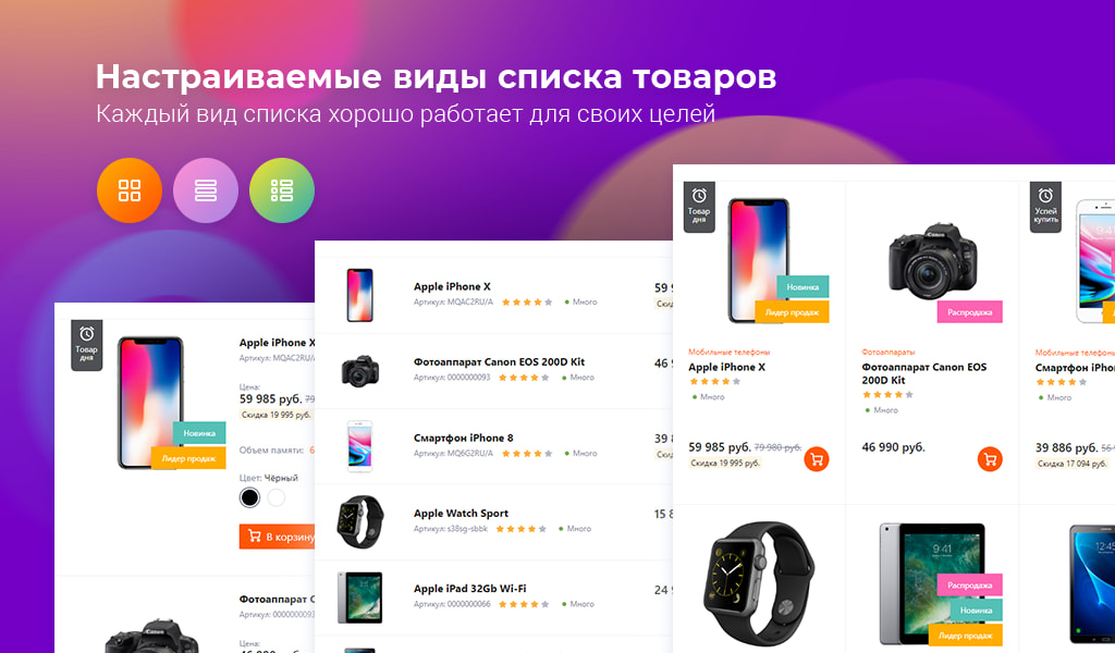 Поддержка дополнительных блоков «наборы и комплекты» «популярные товары», «просмотренные»;